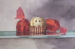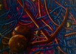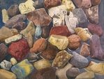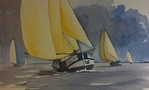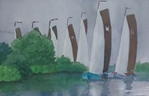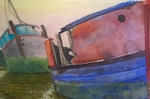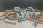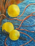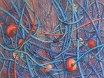 2015Compositie van modern touwwerk, anker, netdrijvers en netten op doek. Dit is een aparte manier van schilderen omdat het linnendoek heel anders reageert dan papier. Het doek wordt ook afgelakt zodat deze aquarel niet achter glas zit en direct als een traditioneel olieverfschilderij kan worden opgehangen. Deze techniek zorgt voor heel heldere kleuren. De techniek is heel tijdrovend maar door het doek kan je op grotere formaten werken.