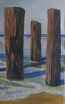 2015Oude zeewering op het strand. De uitgebeten houten palen heb ik in een wastechniek benaderd. Meer dan 20 lagen water en verf.
